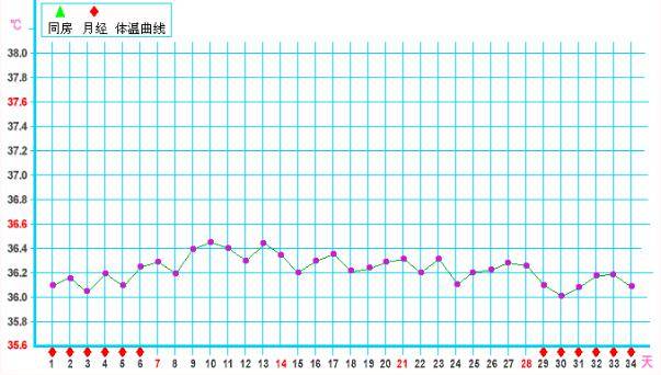 备注:上图示例的已经怀孕的曲线图,从图表中可以看出,从第15天开始高温一直持续到底34天,中间整整持续了20天,一般来说高温持续超过16天左右就预示着已经怀孕了。