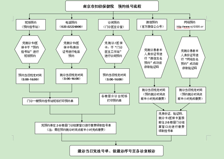 1、微信预约挂号:关注微信公众号——预约挂号——注册账户——在线预约——预约成功——接收验证码——门诊2-8楼结算窗口挂号缴费。(提示:就诊当日预约时间点前半小时完成缴费,逾期作废)